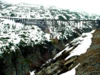 The White Pass railroad, a narrow gauge railway constructed to take minors into the gold fields was a pleasant ride, and gave us many views that would not have been visible otherwise. Mom nearly freaked when she saw the trestle above - but then she heard that we would not be using it. The railway had recently constructed a new "modern" bridge to take the train across the chasm.