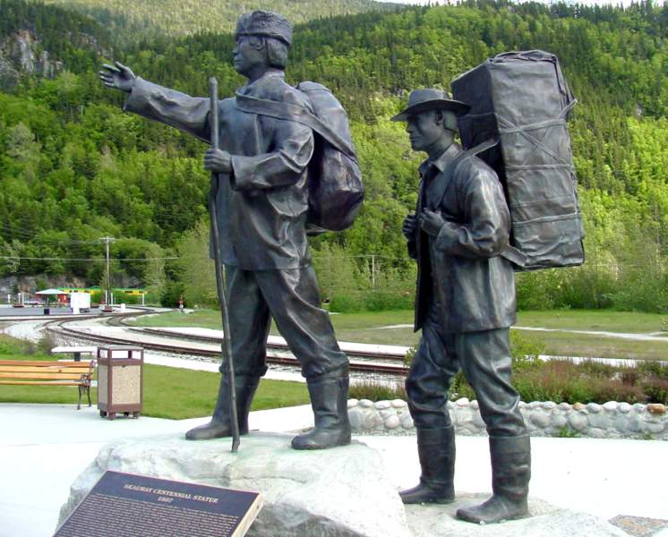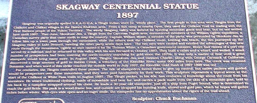 On disembarking at Skagway, we were also greeted with a bronze. This one depicting a gold prospector with his guide and their packs setting out for the gold fields of Canada. Check out the Memorial Plaque